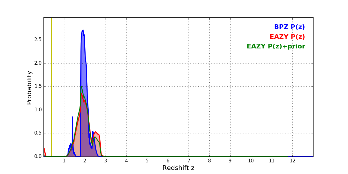 In P(z) plots: Yellow lines mark the cluster redshift z = 0.390,