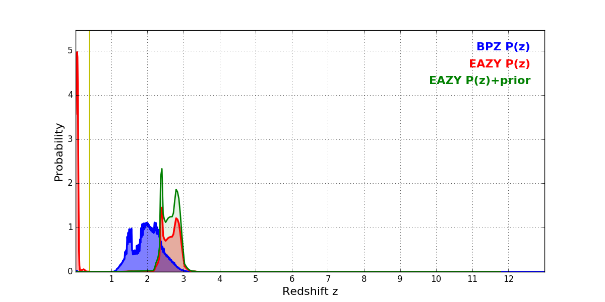 In P(z) plots: Yellow lines mark the cluster redshift z = 0.390,