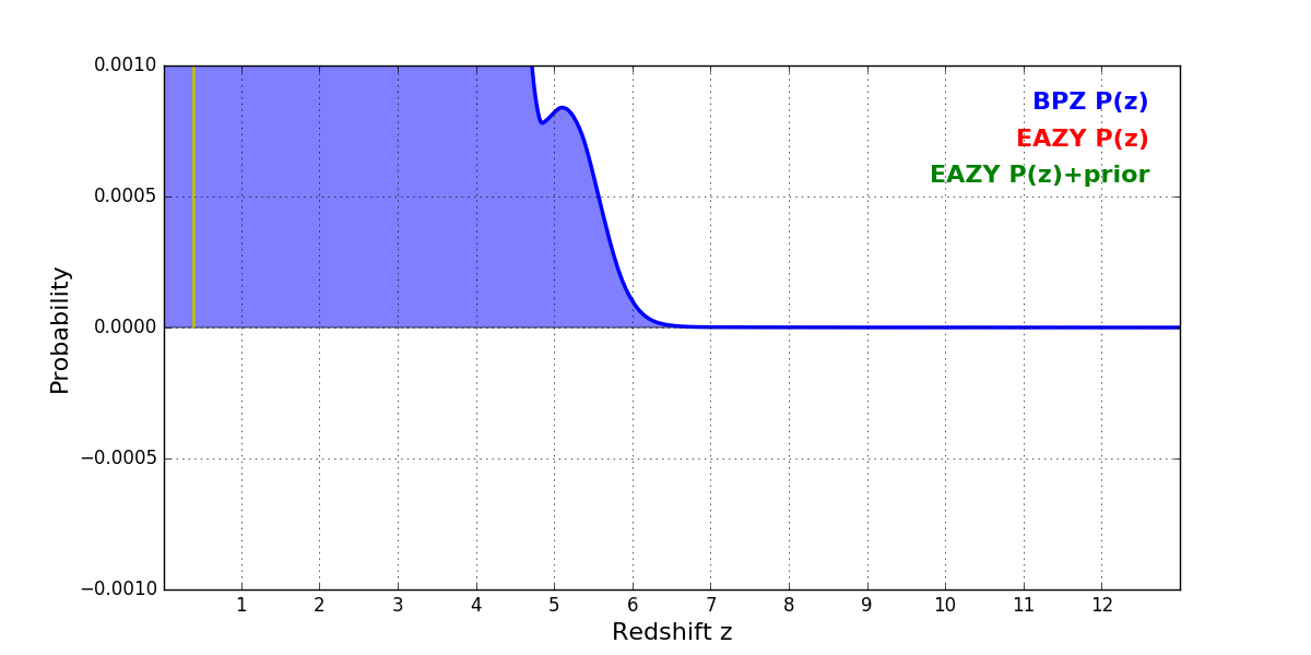 In P(z) plots: Yellow lines mark the cluster redshift z = 0.390,