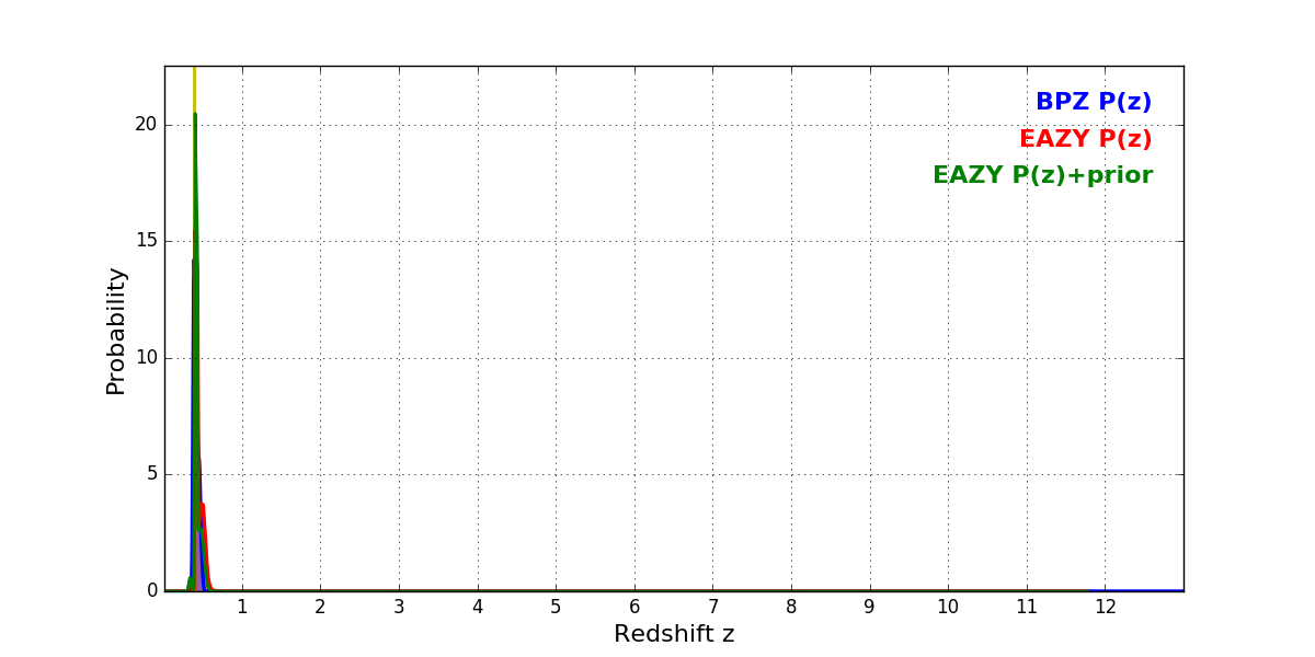 In P(z) plots: Yellow lines mark the cluster redshift z = 0.390,