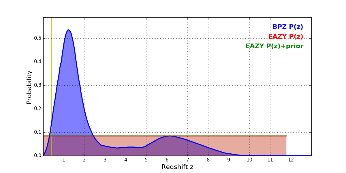 In P(z) plots: Yellow lines mark the cluster redshift z = 0.390,