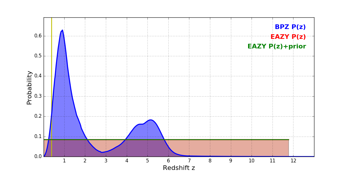In P(z) plots: Yellow lines mark the cluster redshift z = 0.390,