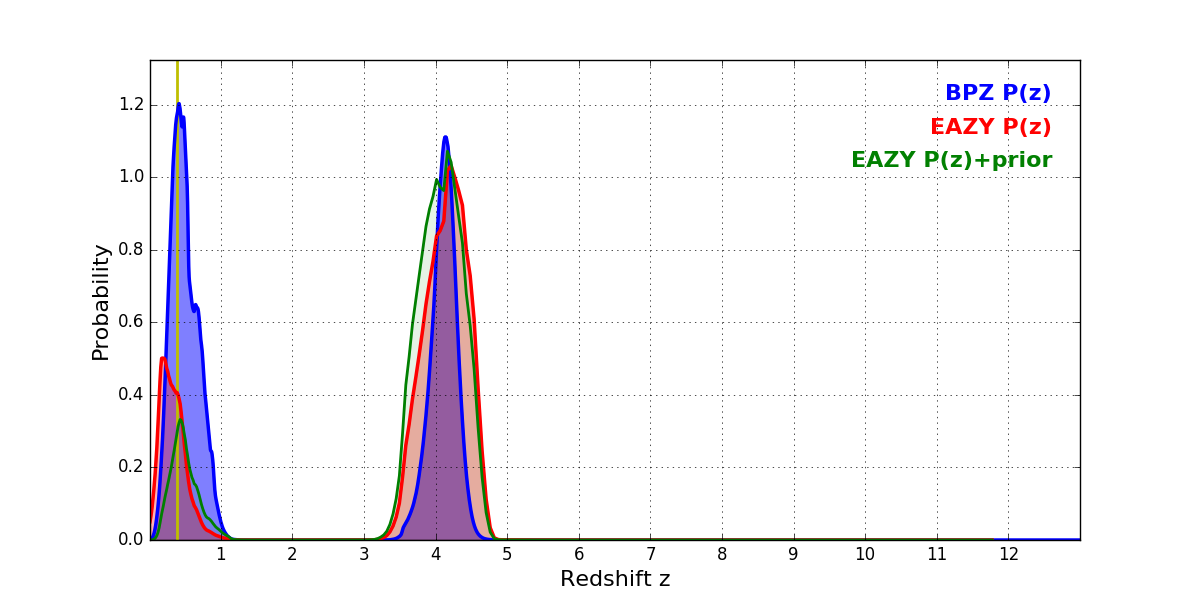 In P(z) plots: Yellow lines mark the cluster redshift z = 0.390,