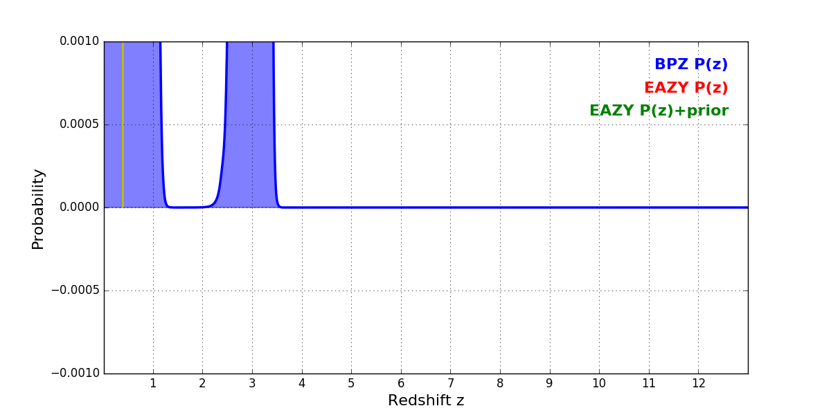 In P(z) plots: Yellow lines mark the cluster redshift z = 0.390,