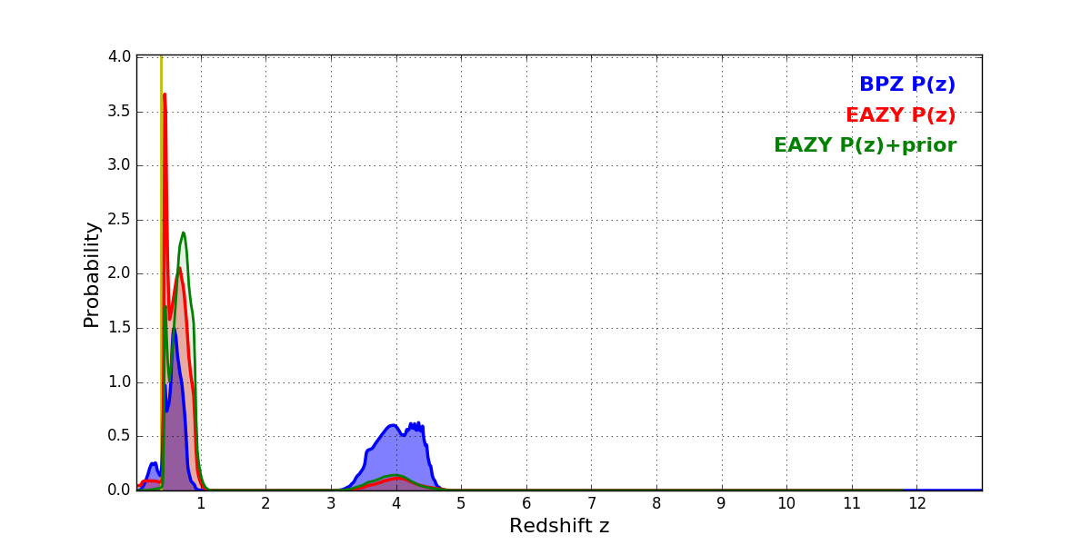 In P(z) plots: Yellow lines mark the cluster redshift z = 0.390,