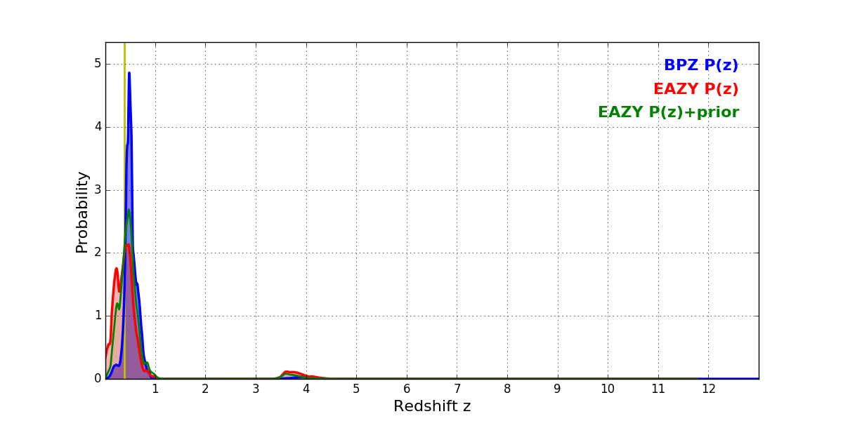 In P(z) plots: Yellow lines mark the cluster redshift z = 0.390,