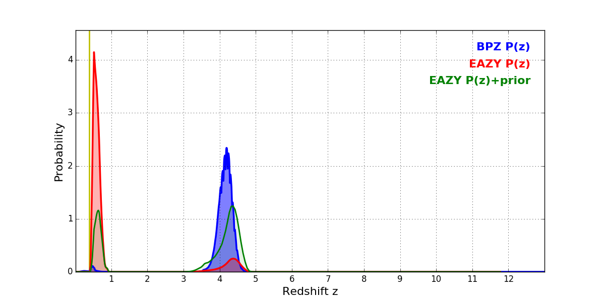 In P(z) plots: Yellow lines mark the cluster redshift z = 0.390,
