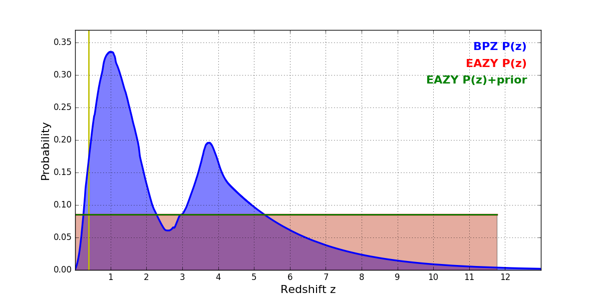 In P(z) plots: Yellow lines mark the cluster redshift z = 0.390,