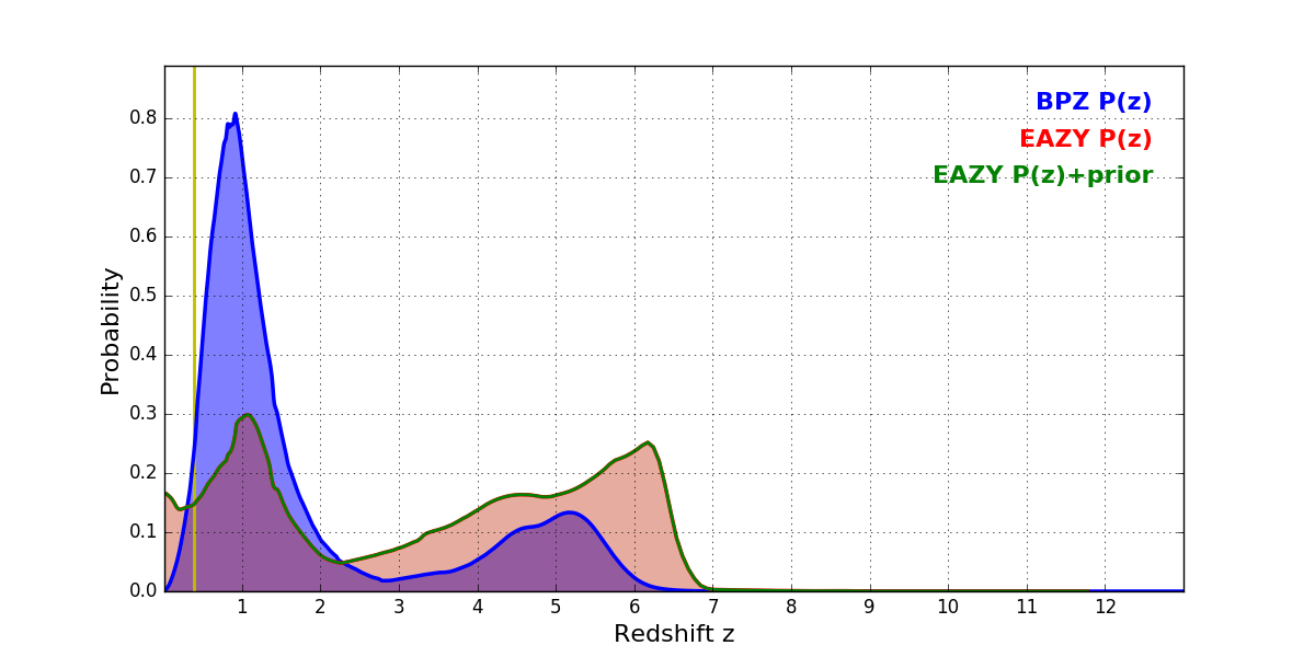 In P(z) plots: Yellow lines mark the cluster redshift z = 0.390,