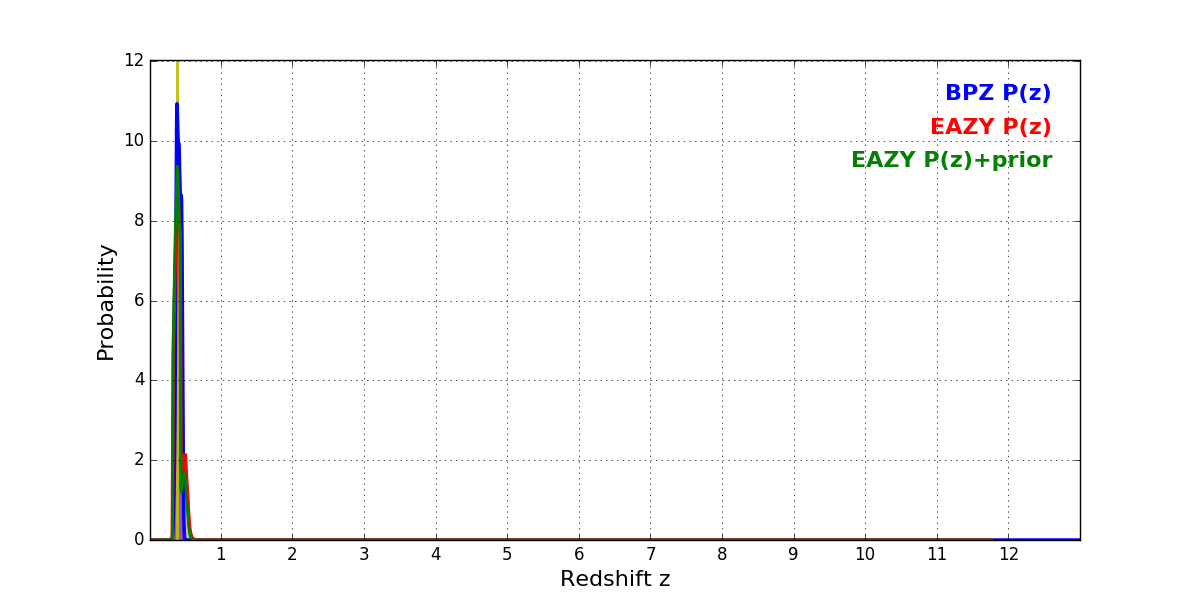 In P(z) plots: Yellow lines mark the cluster redshift z = 0.390,