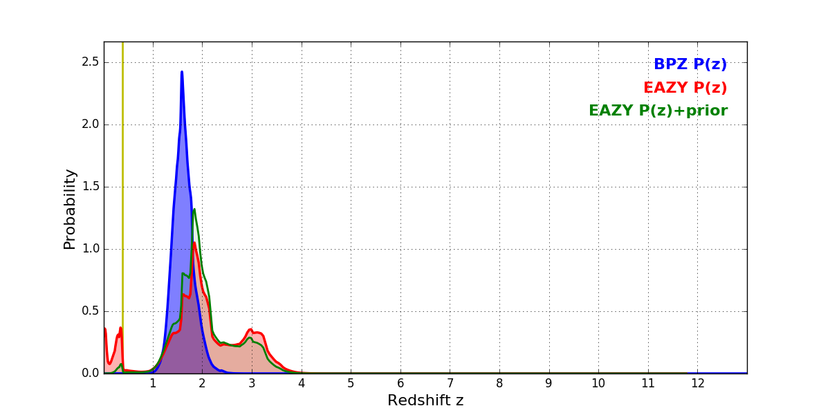 In P(z) plots: Yellow lines mark the cluster redshift z = 0.390,