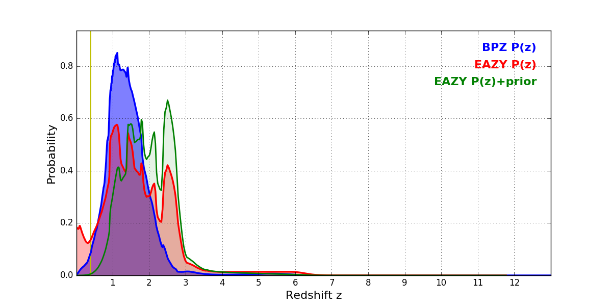 In P(z) plots: Yellow lines mark the cluster redshift z = 0.390,
