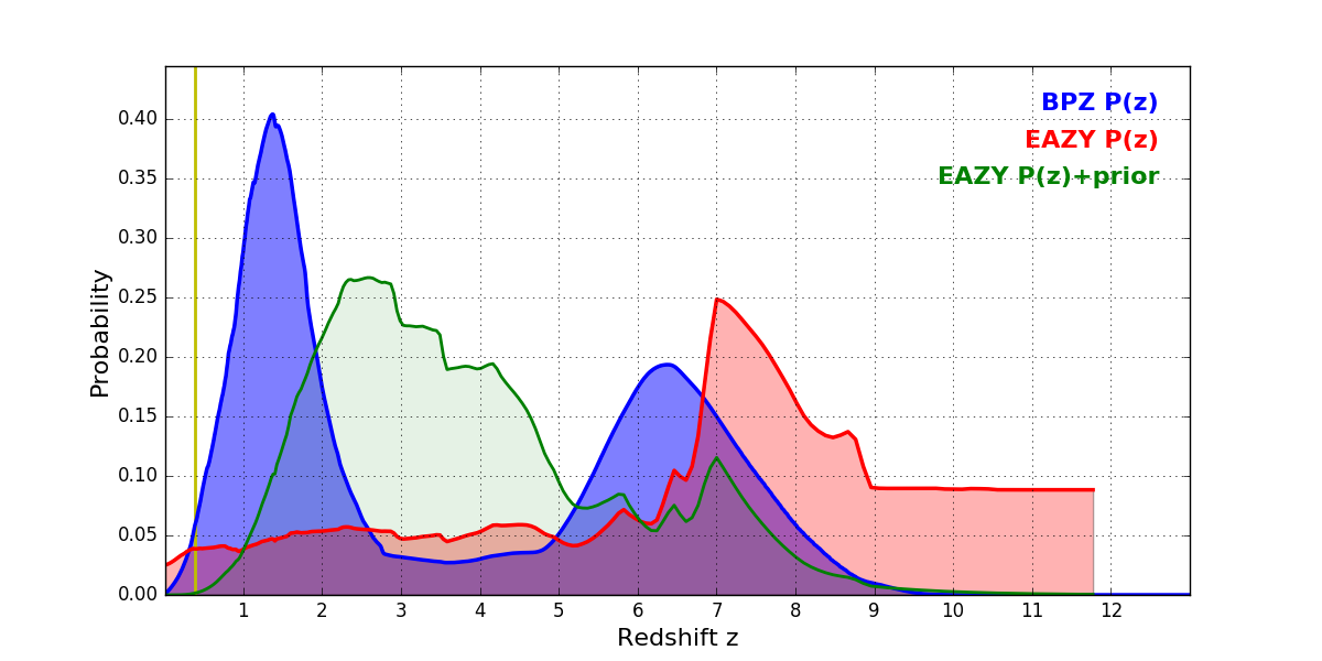 In P(z) plots: Yellow lines mark the cluster redshift z = 0.390,