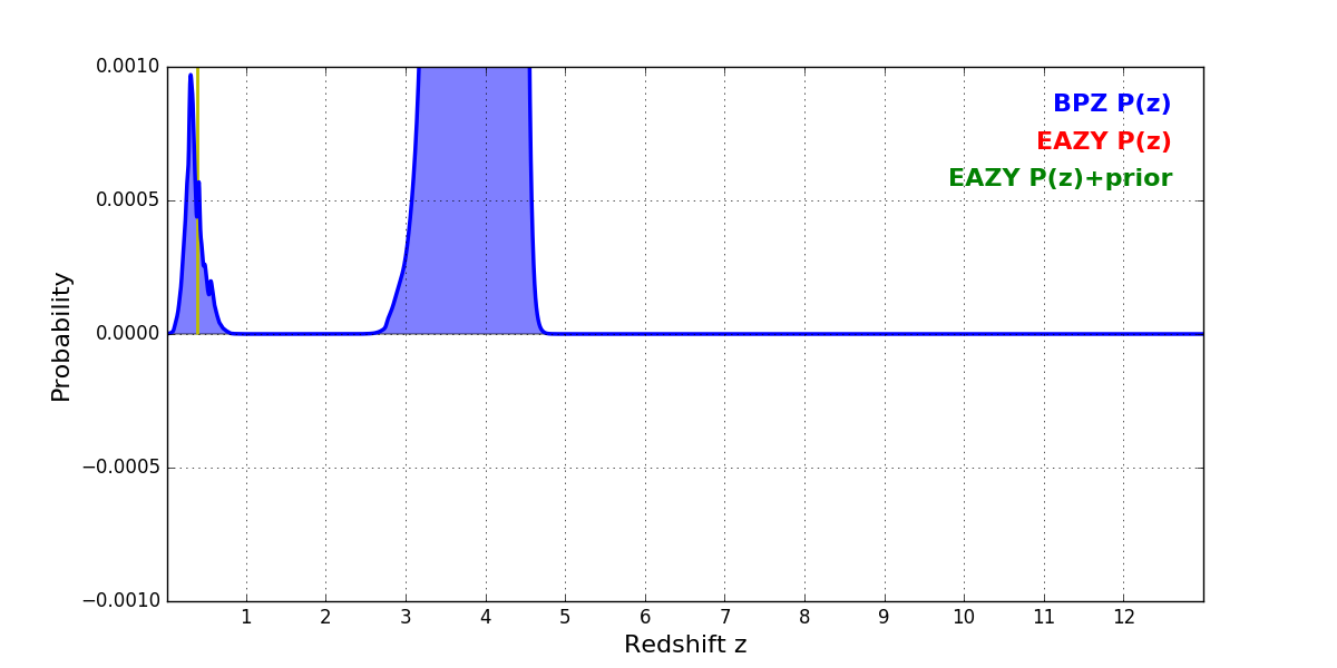 In P(z) plots: Yellow lines mark the cluster redshift z = 0.390,