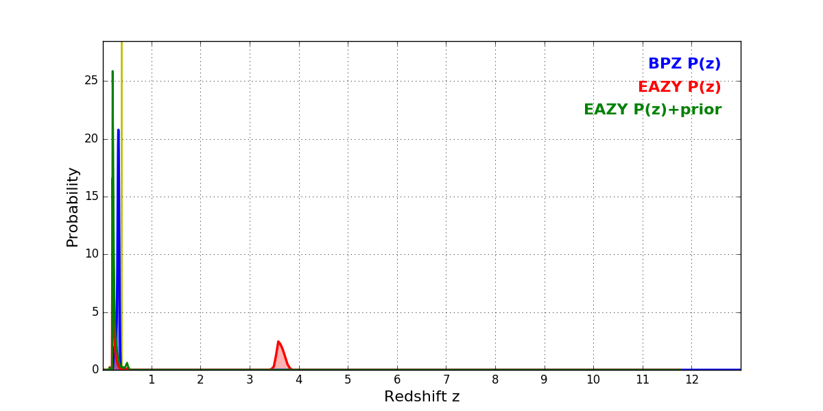 In P(z) plots: Yellow lines mark the cluster redshift z = 0.390,