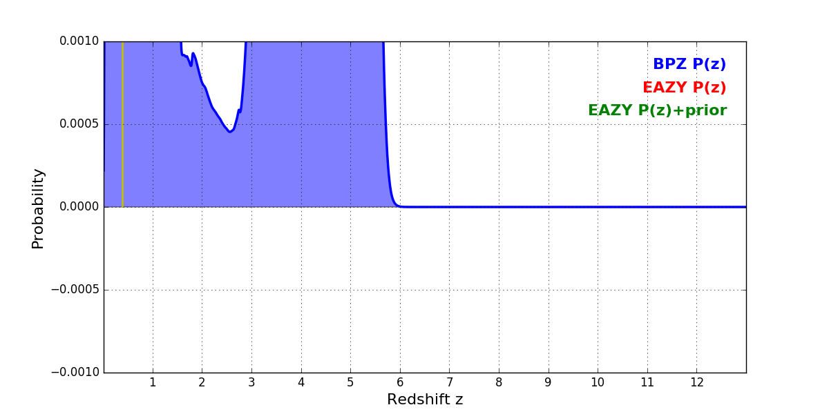 In P(z) plots: Yellow lines mark the cluster redshift z = 0.390,