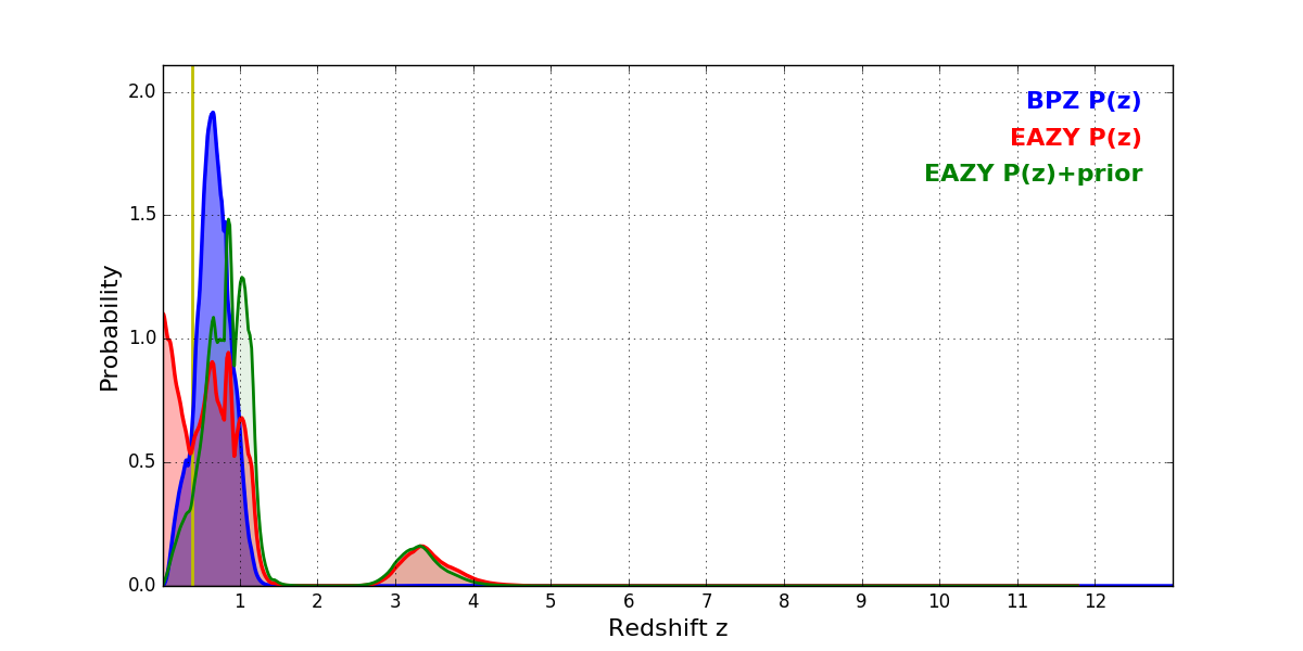 In P(z) plots: Yellow lines mark the cluster redshift z = 0.390,