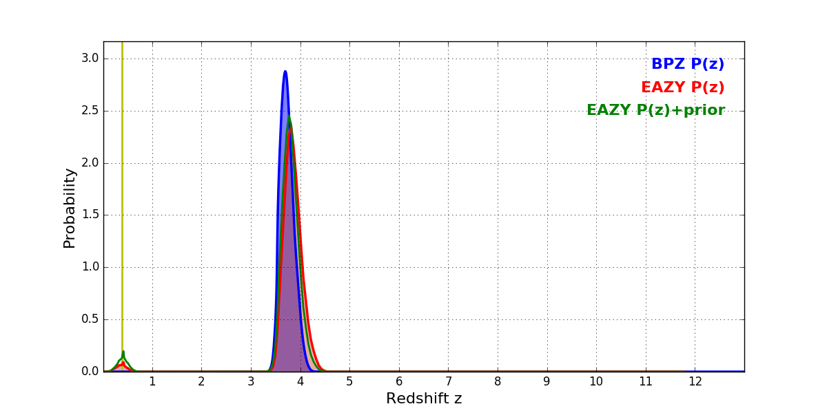 In P(z) plots: Yellow lines mark the cluster redshift z = 0.390,