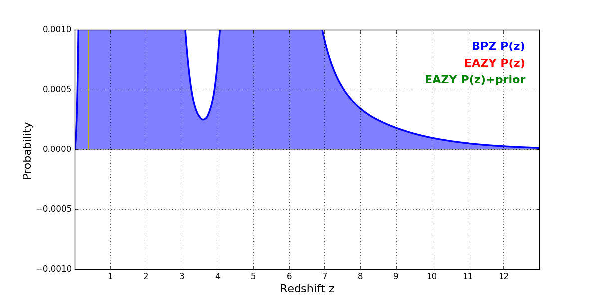 In P(z) plots: Yellow lines mark the cluster redshift z = 0.390,