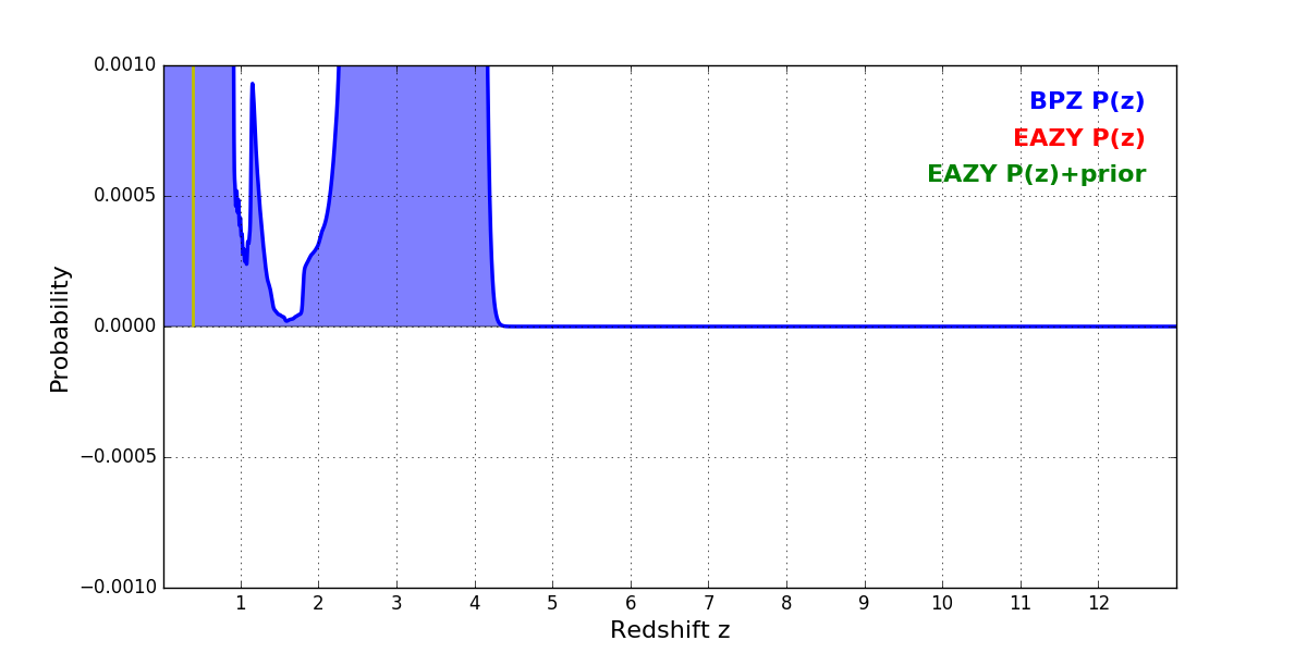 In P(z) plots: Yellow lines mark the cluster redshift z = 0.390,