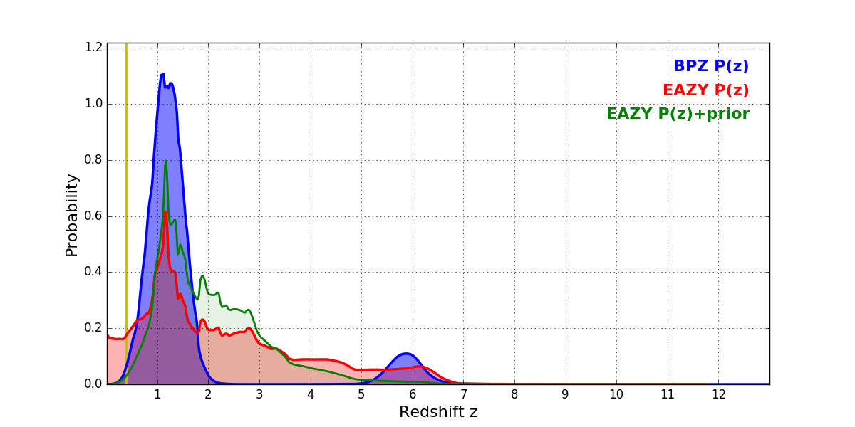 In P(z) plots: Yellow lines mark the cluster redshift z = 0.390,