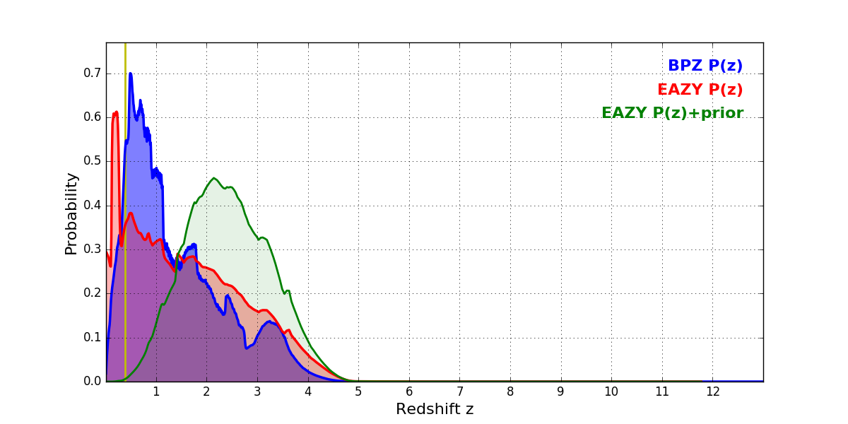 In P(z) plots: Yellow lines mark the cluster redshift z = 0.390,