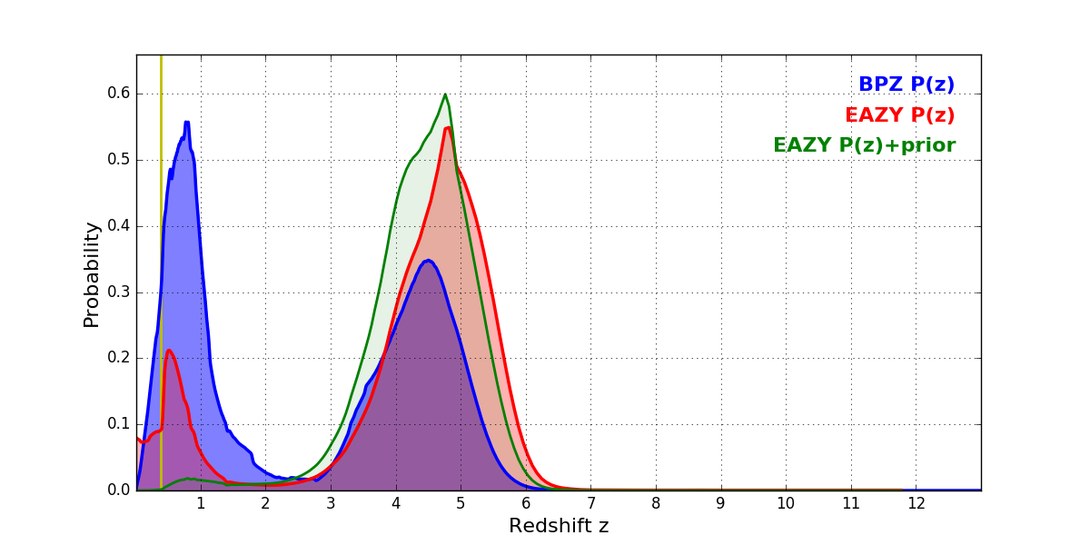 In P(z) plots: Yellow lines mark the cluster redshift z = 0.390,
