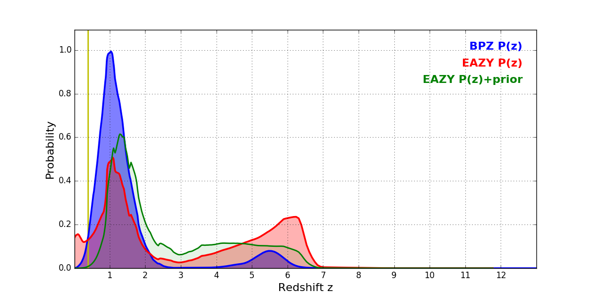 In P(z) plots: Yellow lines mark the cluster redshift z = 0.390,