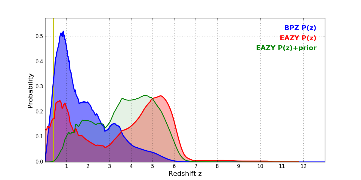 In P(z) plots: Yellow lines mark the cluster redshift z = 0.390,