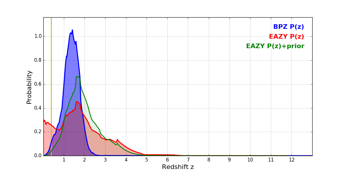 In P(z) plots: Yellow lines mark the cluster redshift z = 0.390,