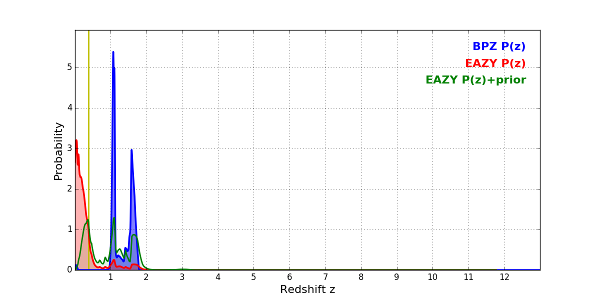 In P(z) plots: Yellow lines mark the cluster redshift z = 0.390,