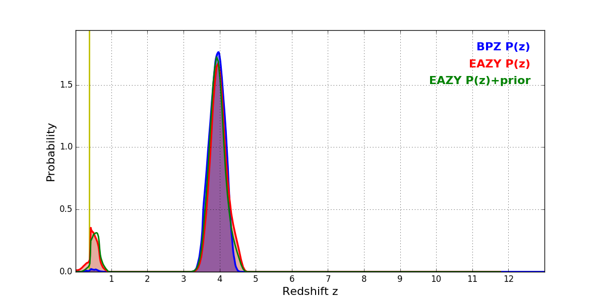 In P(z) plots: Yellow lines mark the cluster redshift z = 0.390,