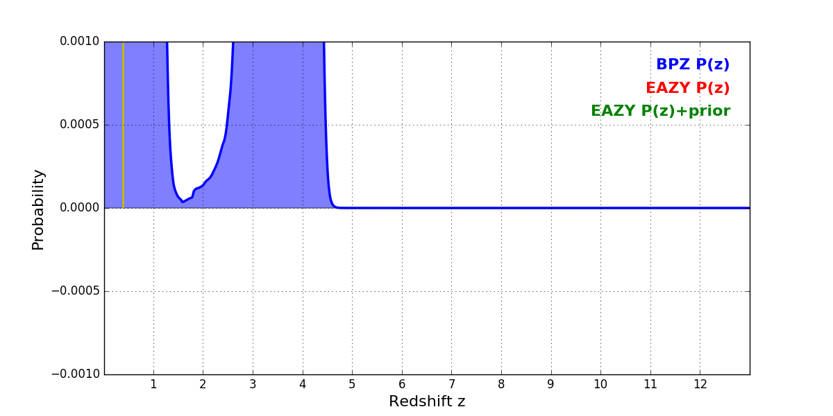 In P(z) plots: Yellow lines mark the cluster redshift z = 0.390,