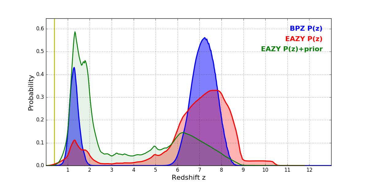 In P(z) plots: Yellow lines mark the cluster redshift z = 0.390,