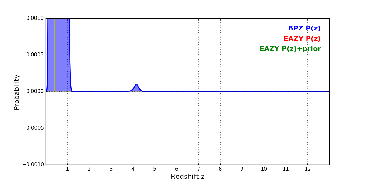 In P(z) plots: Yellow lines mark the cluster redshift z = 0.390,