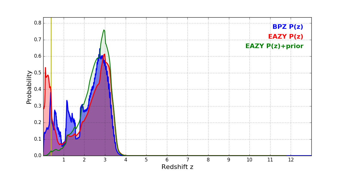 In P(z) plots: Yellow lines mark the cluster redshift z = 0.390,