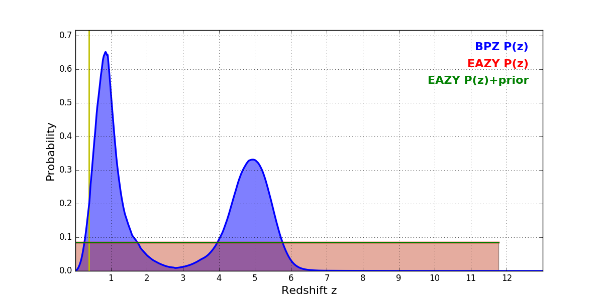 In P(z) plots: Yellow lines mark the cluster redshift z = 0.390,