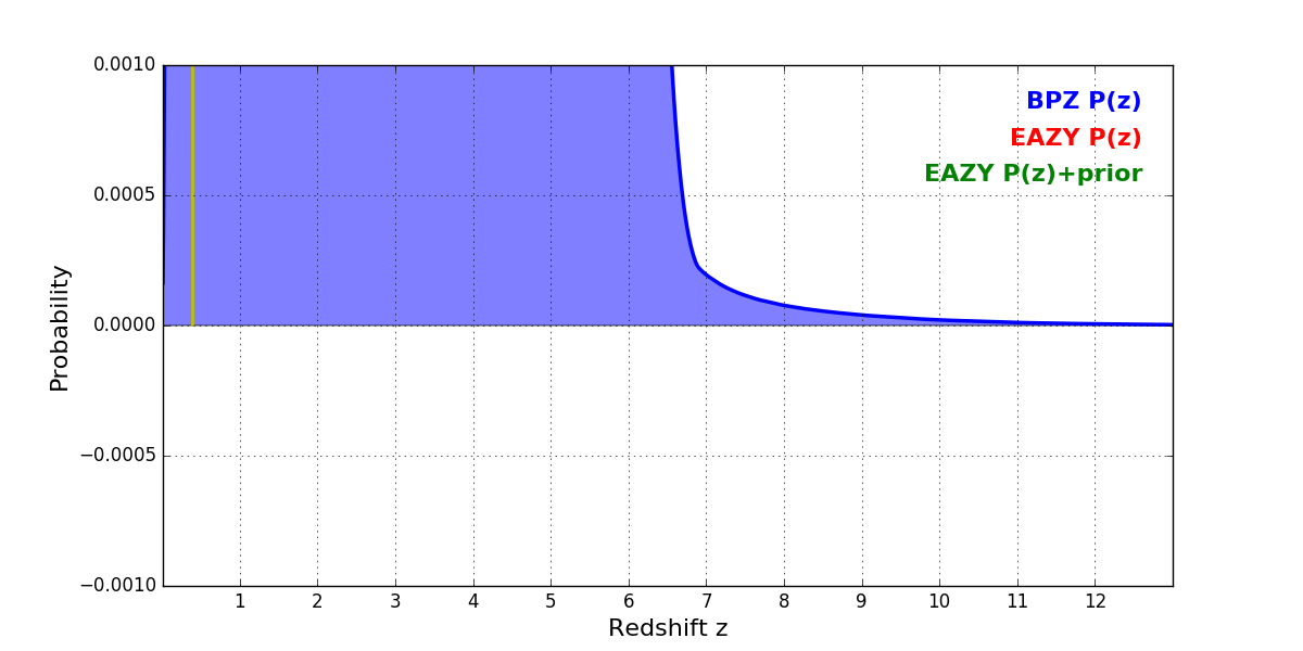 In P(z) plots: Yellow lines mark the cluster redshift z = 0.390,