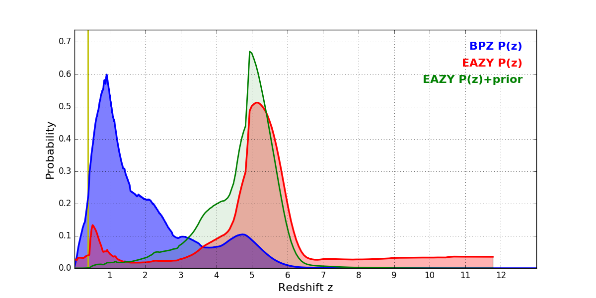 In P(z) plots: Yellow lines mark the cluster redshift z = 0.390,