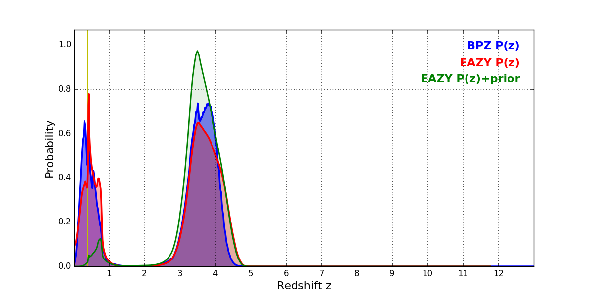 In P(z) plots: Yellow lines mark the cluster redshift z = 0.390,