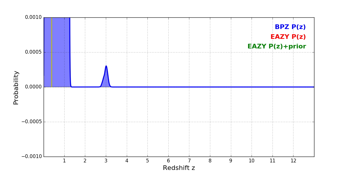 In P(z) plots: Yellow lines mark the cluster redshift z = 0.390,