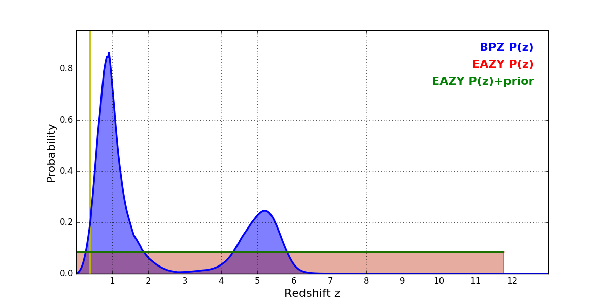 In P(z) plots: Yellow lines mark the cluster redshift z = 0.390,