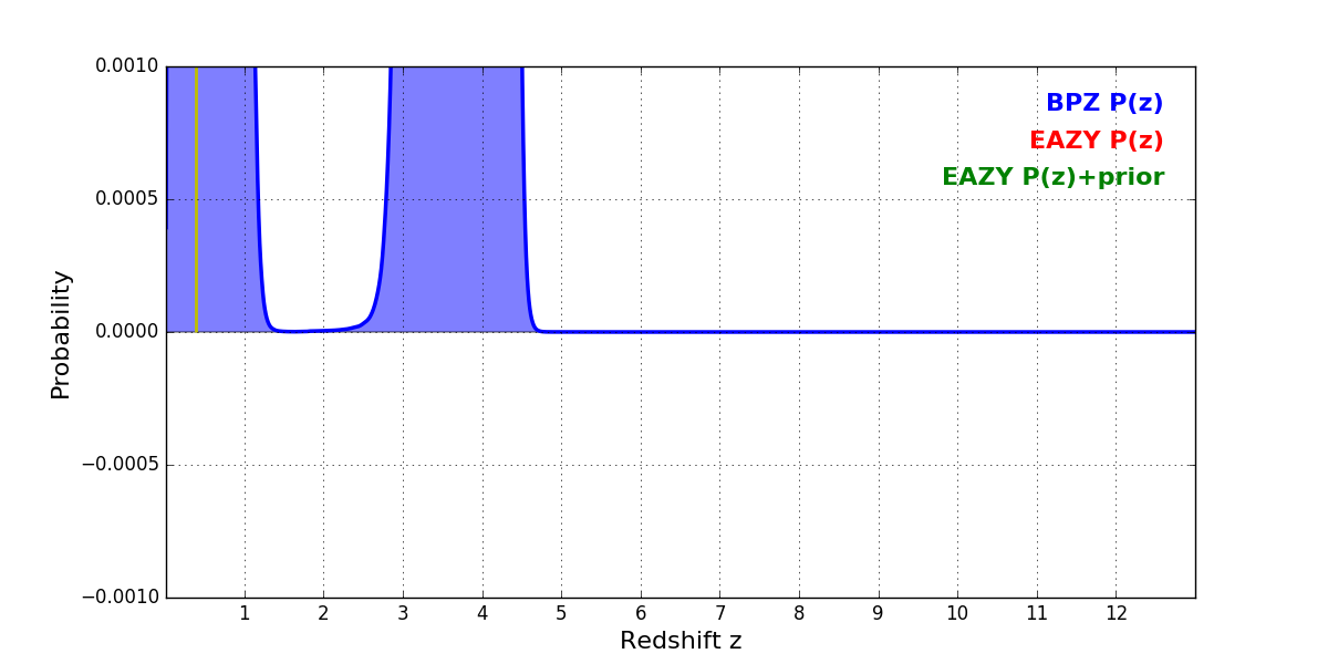 In P(z) plots: Yellow lines mark the cluster redshift z = 0.390,