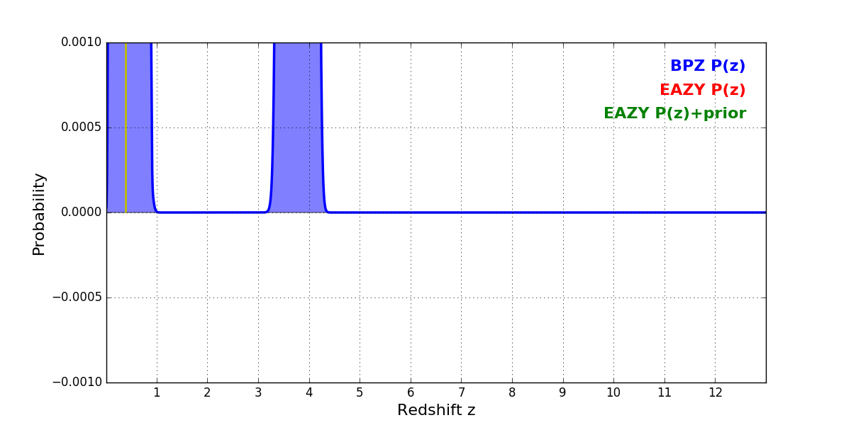 In P(z) plots: Yellow lines mark the cluster redshift z = 0.390,