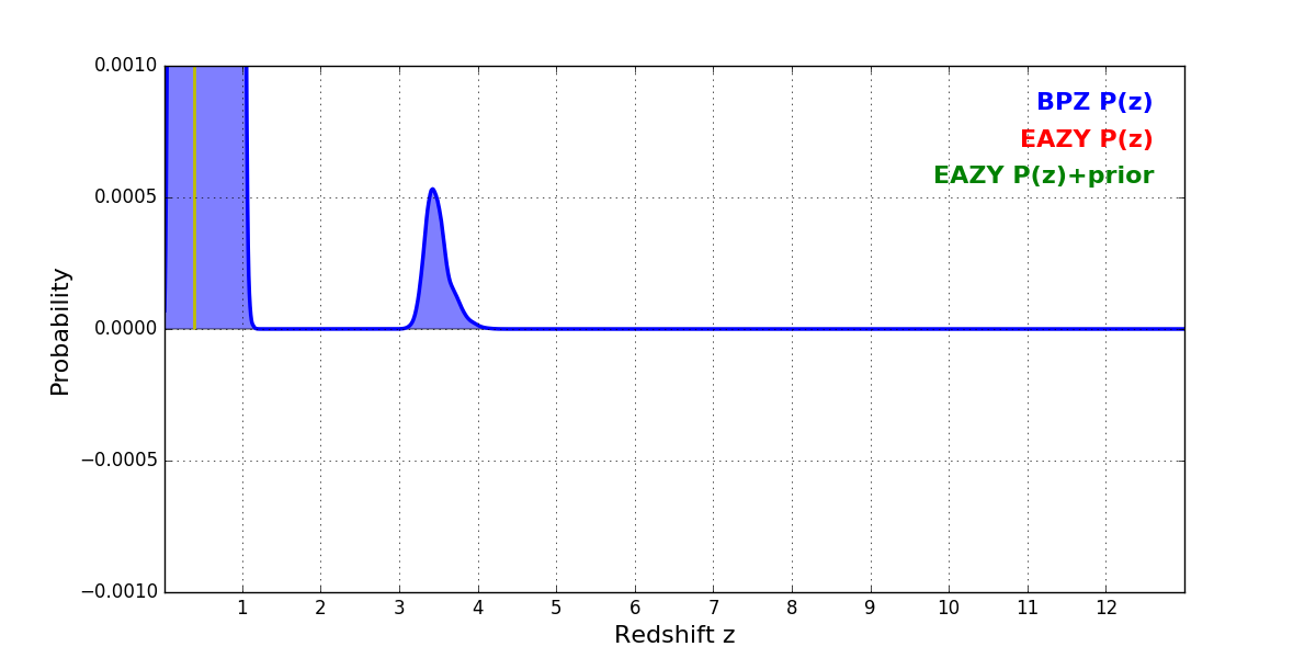 In P(z) plots: Yellow lines mark the cluster redshift z = 0.390,