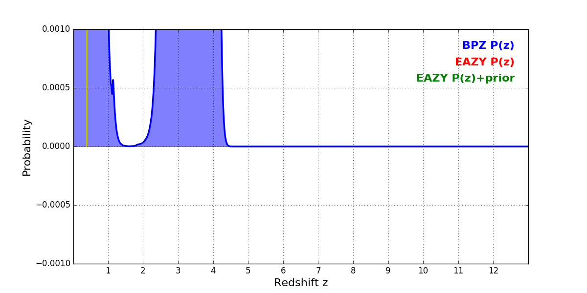 In P(z) plots: Yellow lines mark the cluster redshift z = 0.390,