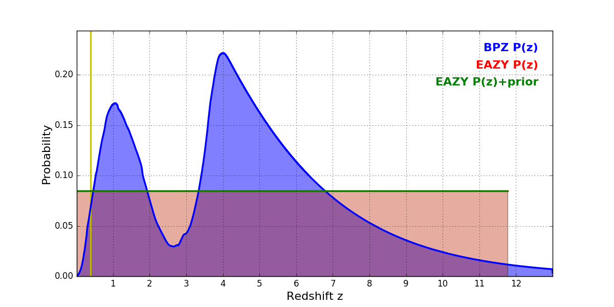 In P(z) plots: Yellow lines mark the cluster redshift z = 0.390,