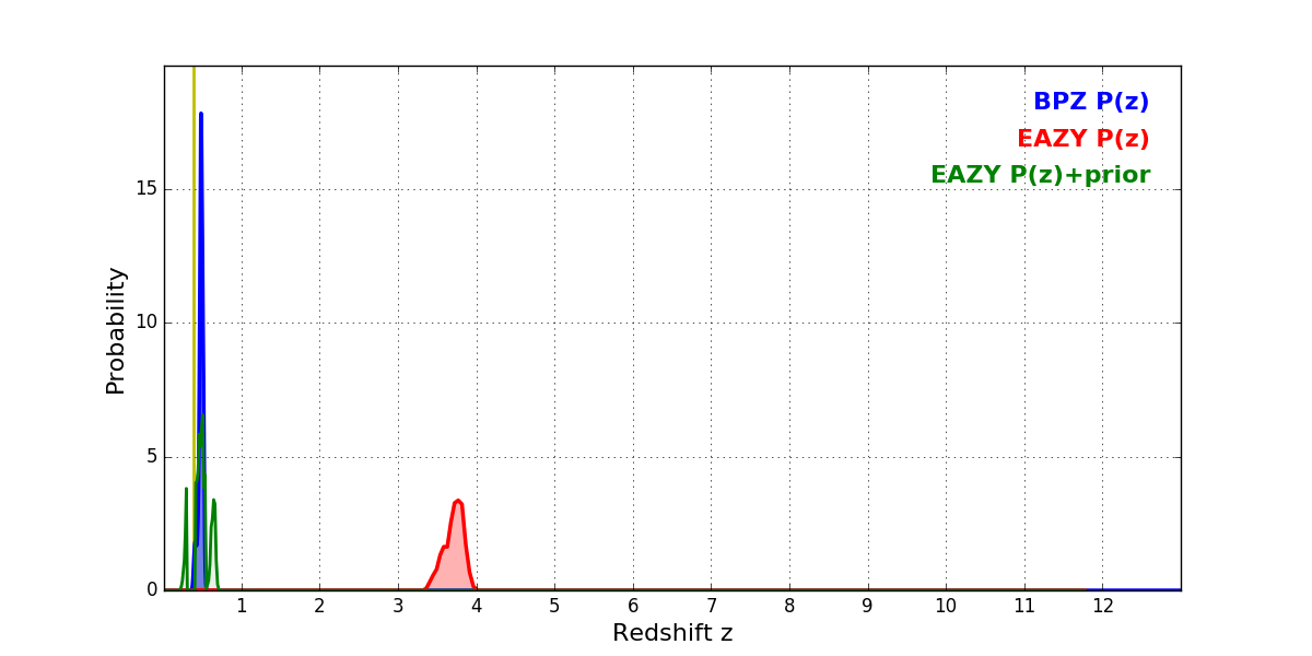 In P(z) plots: Yellow lines mark the cluster redshift z = 0.390,