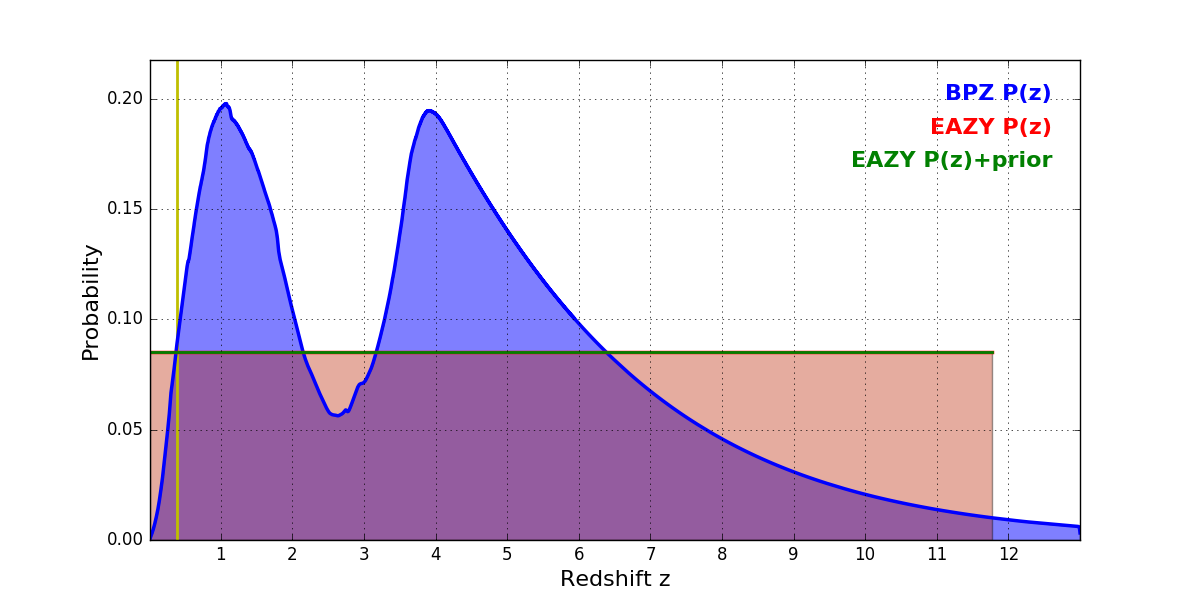 In P(z) plots: Yellow lines mark the cluster redshift z = 0.390,