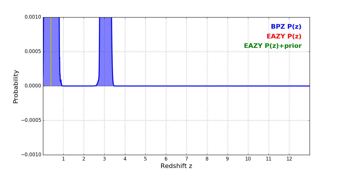 In P(z) plots: Yellow lines mark the cluster redshift z = 0.390,